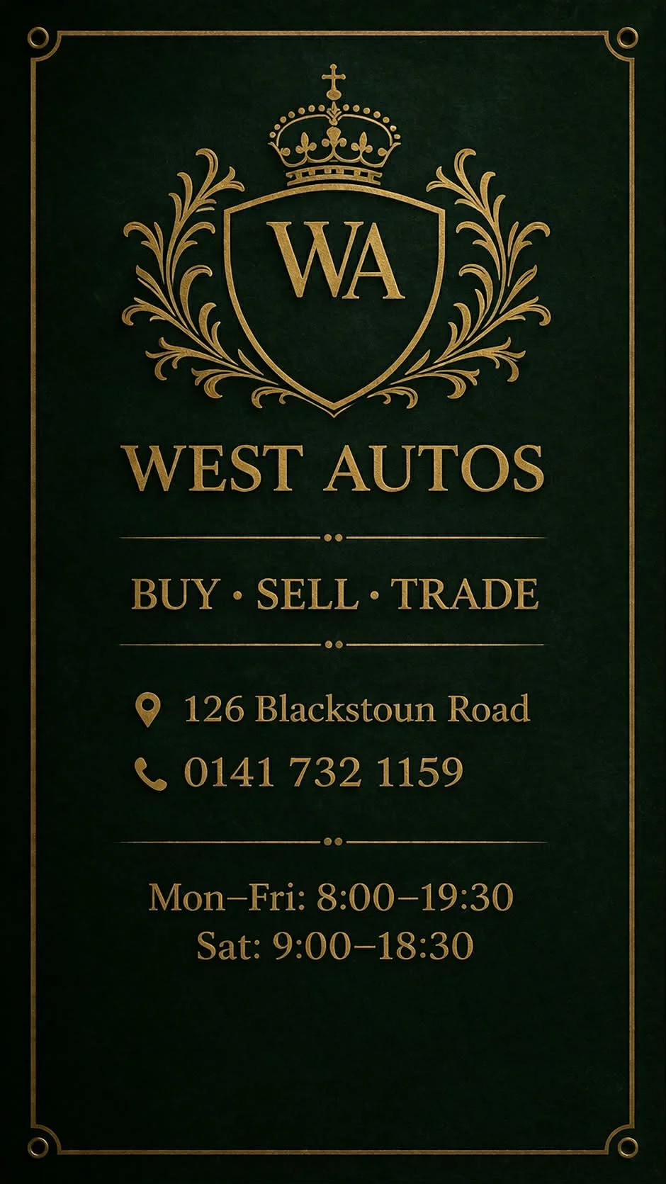⸻ Alexander Milne Sales, Finance & Customer Support Vehicle procurement and customer enquiries info@westautos.co.uk complaints@westautos.co.uk